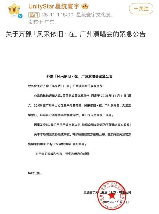 朋友圈那天铺满一张图,齐豫演唱会延期的公告,眼睛盯在“团队成员突发意外”几个字,话说得很稳,意思压着不往外走,屏幕那头像是有人不肯把门开大一点,手指停住,心里已经猜到八成是谁,几个音乐群直接炸开,名字被刷了好几行,屠颖走了,陈子鸿发了悼念,一行字把唱片内页里那个常年躲在角落的署名推到台前。